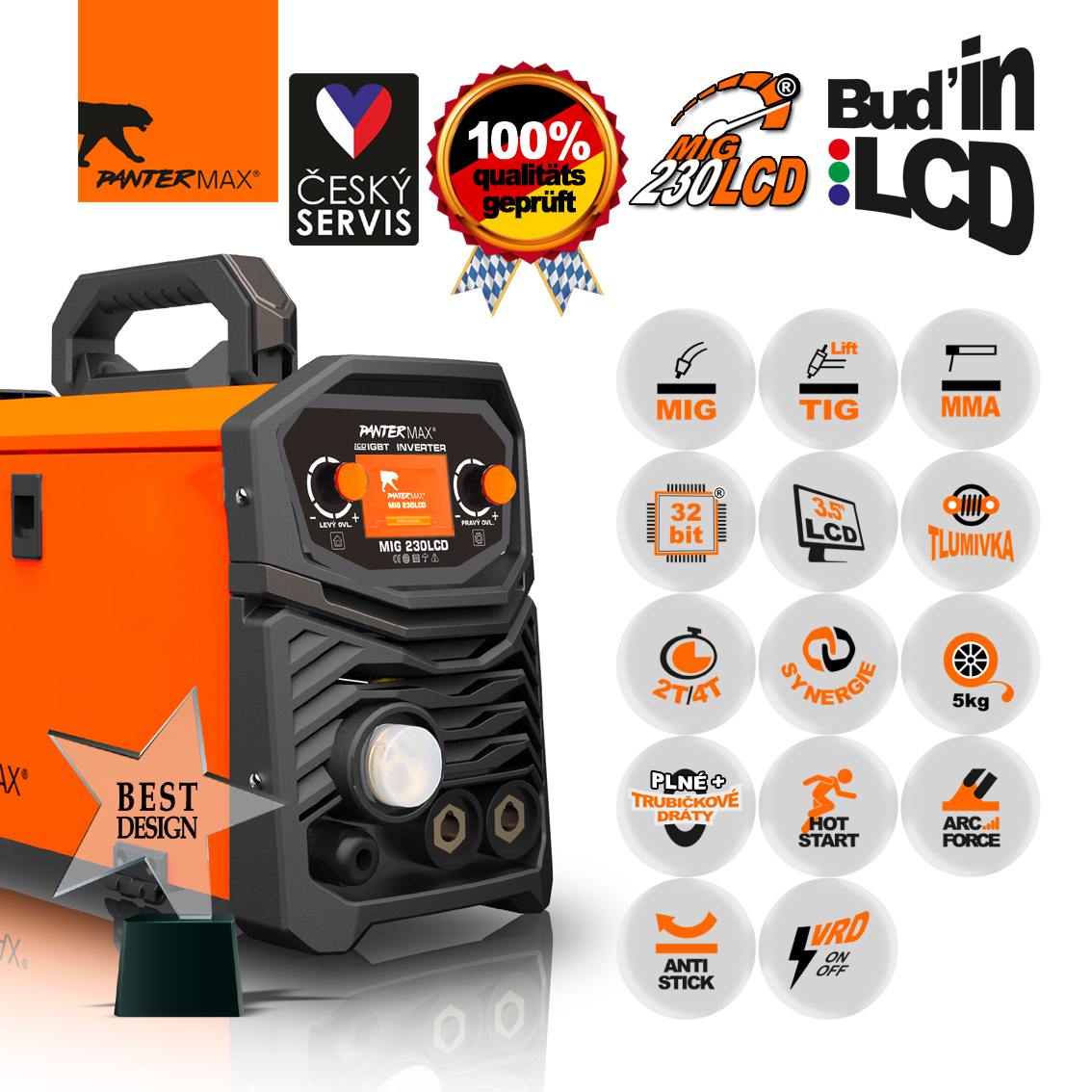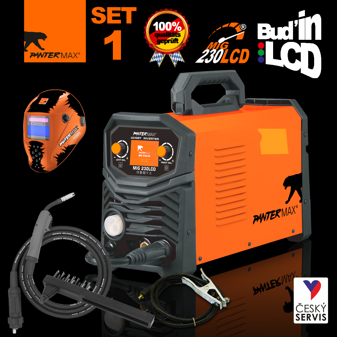 PANTERMAX® MIG230LCD je synergický mikroprocesorový svařovací zdroj pro svařování metodami MIG/MAG/MMA/LiftTIG.  IGBT invertorový zdroj řízený 32bitovým procesorem a velkým barevným LCD displejem umožňuje svařování metodou MIG/MAG za použití jak standardních plných drátů v ochranné atmosféře plynu (např.G3Si1), tak i trubičkových drátů s ochranným plynem nebo bez. Grafické rozhraní a synergie použitá ve zdroji usnadňují používání a umožňují použití zdroje i lidmi s minimálními zkušenostmi. IGBT technologie umožňuje významné snížení hmotnosti a rozměrů zdroje a zvýšení účinnosti při snížení spotřeby energie.